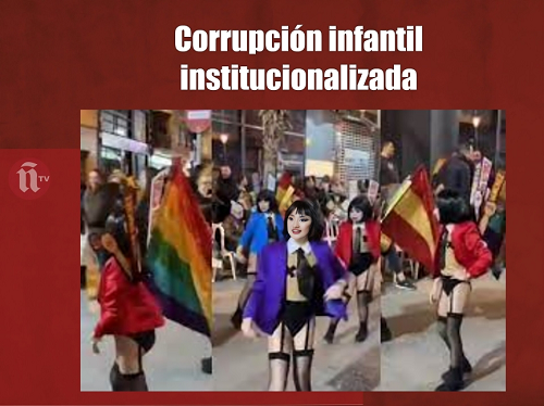 Pues bien, de ahí, hemos pasado a la educación sexual a los párvulos y a toda la degeneración a la que asistimos, como la última que ha denunciado la Asociación Abogados Cristianos: el Carnaval organizado por el Ayuntamiento de Torrevieja con el lema “Prometer hasta meter”, en el que se sexualiza a niñas que desfilan con lencería erótica y banderas LGTB. Un grotesco espectáculo, como es definido por Abogados Cristianos, donde las niñas desfilan vestidas de forma provocativa y pezoneras. Sin duda alguna, “una oda a la cultura de la pedofilia que contó con el reconocimiento del ayuntamiento” …