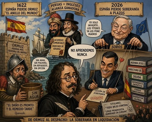 Hasta que en 1622 llegaron los persas con los ingleses, cortaron el agua (detalle sin importancia, al parecer), bloquearon suministros y dejaron a 500 soldados mirando al horizonte… sin horizonte. Fin de la historia. O más bien, inicio del final. Porque mientras unos movían fichas, aquí se seguía redactando informes. Como bien resumió Francisco de Quevedo: “El daño es pronto y el remedio tarde.” Traducción libre: cuando reaccionas, ya te han vendido la casa… con hipoteca incluida.