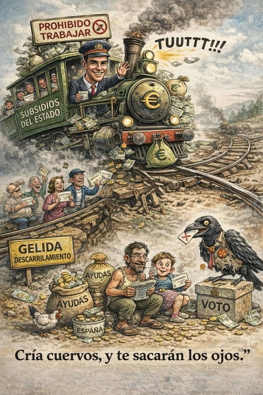 Así, mientras las costuras sociales se descosen, el Gobierno cose votos con hilo público. Y si el tren vuelve a descarrilar, no pasa nada, porque siempre habrá un subsidio para olvidar el golpe y una rueda de prensa para repartir culpas al pasado, a Europa o al maquinista.