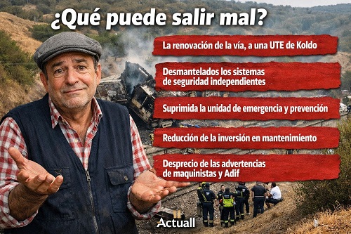 Tercero. Corrupción. Resulta que la renovación de la vía a su paso por Aldamuz la hizo una UTE contactada por Koldo por 61 millones de euros. Presuntamente previa coima. Prima la comisión a la calidad del servicio. De hecho, la UCO ya investigaba a la empresa por la trama Koldo. El mismo Tribunal de Cuentas ya advirtió de fallos en el sistema de control de los contratos.