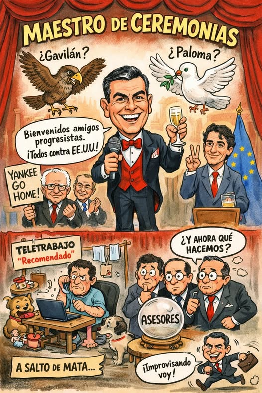 el mundo celebra la apertura del estrecho de Ormuz, en un nuevo ejercicio de escapismo digno de Houdini, pero sin cadenas, que incomodan, nuestro presidente aterriza en Barcelona convertido en maestro de ceremonias de una cumbre progresista mundial. Una especie de “festival de Eurovisión ideológica”, donde cada país trae su canción… pero todos comparten el mismo estribillo: “la culpa es de Estados Unidos”.
