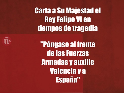 Majestad, a fuer de ser ingenuo y absurdo en mi petición, dirija los destinos de España en la tragedia. La Historia y nuestro extremadamente compungido presente lo agradecerán por siempre. Auxilie a Valencia y a España que hoy grita de dolor en busca de oídos del alma que la escuchen.