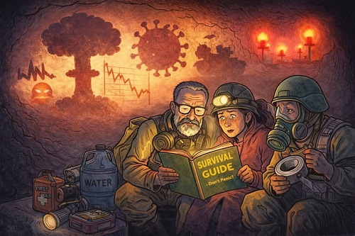Te enseñan cómo sellar ventanas, cómo almacenar agua, qué hacer si hay radiación, qué países serían más seguros… como si el caos global pudiera resolverse con una lista de consejos prácticos.