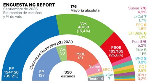 Ambas encuestas son consistentes con una tendencia de las últimas semanas: Vox sube sustancialmente y recupera o supera o se queda cerca de los 52 que llegó a tener; el PP sube por el desgaste del PSOE que pierde aunque tampoco mucho.