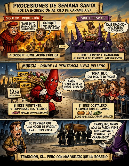 Hoy, Domingo de Ramos, da comienzo a la Semana Santa. Y resulta que eso tan solemne, tan espiritual y tan fotogénico de la Semana Santa… tiene un origen que, si lo miras de reojo, da más para novela negra que para estampita devocional.
