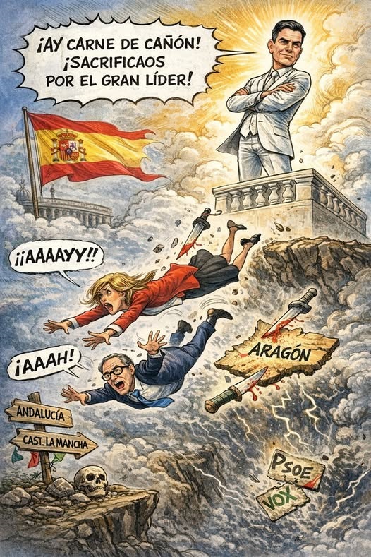 Porque en este ecosistema político hay una ley no escrita, el líder permanece, los peones se sacrifican. Sánchez no pierde elecciones; pierden “los territorios”. Él no se equivoca; se equivocan “los contextos”. Él no cae; caen los que estaban debajo. Y mientras tanto, desde Moncloa se ensayan nuevos experimentos en otras comunidades, como quien prueba un motor en banco de pruebas, si se quema, se cambia la pieza y listo.
