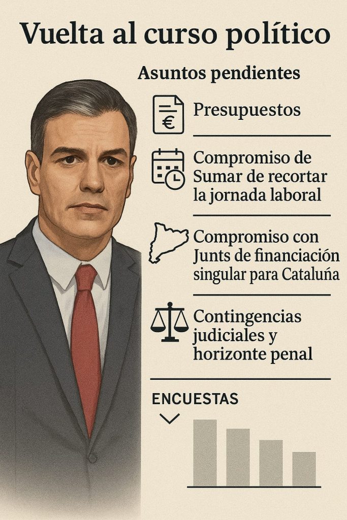 Sánchez apura sus últimas horas en La Mareta consciente de que el regreso será duro. Le espera un curso político con todas los flecos con los que acabó el pasado. ¿El principal? Los presupuestos. Seguir huyendo hacia adelante ya no es una opción. Su obligación es presentar cuentas y retratar su apoyo parlamentario a la ley más importante que decide en qué se gasta el dinero de todos y a quien paga la factura.